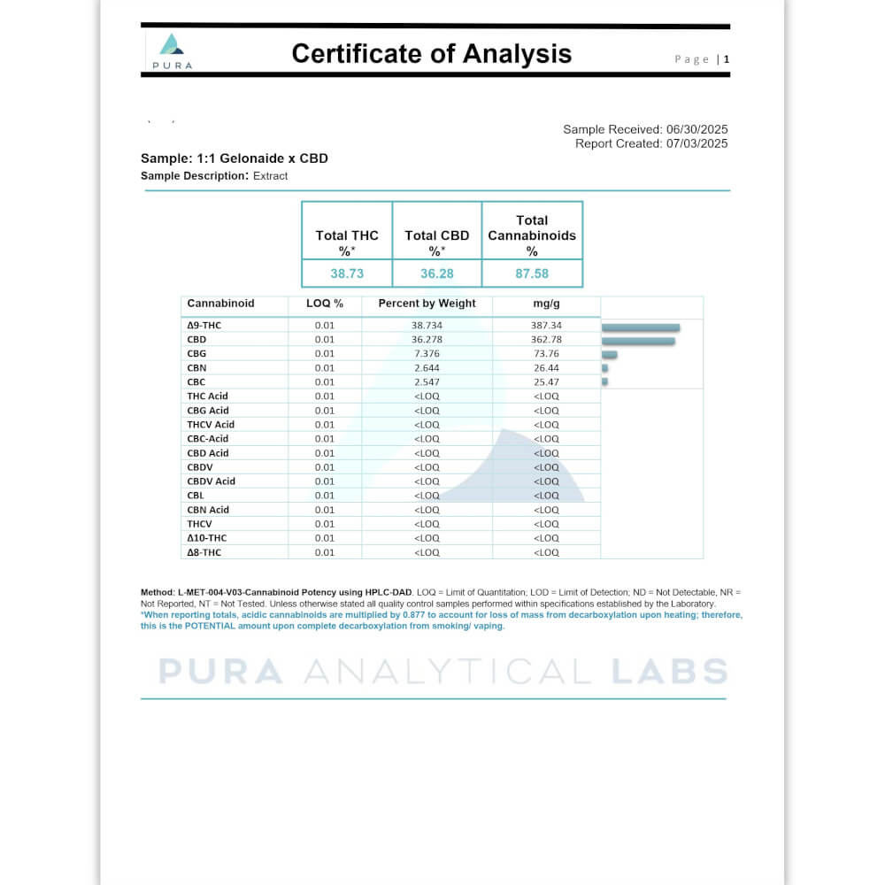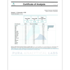 This high-end RSO has been independently tested at MB labs to contain over 87.79% cannabinoids, including 38.6% THC and 36.3% CBD!
