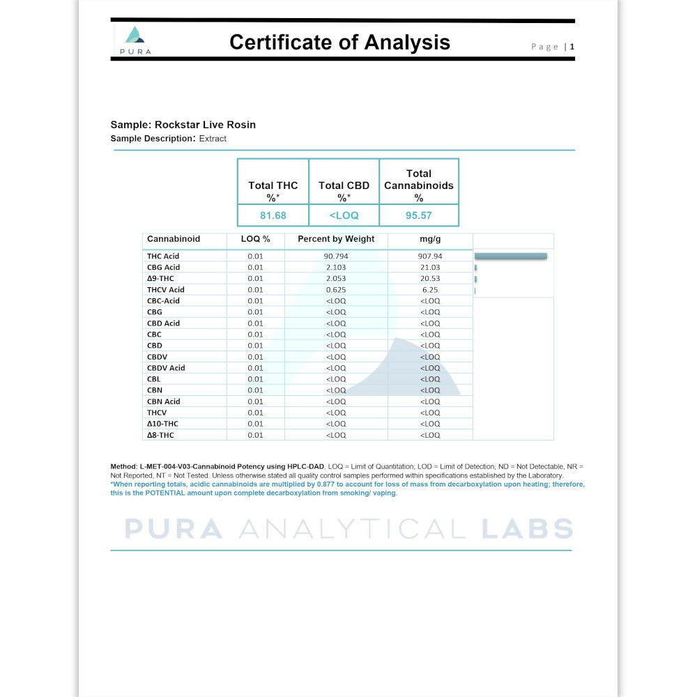 This high-end Live Resin has been independently tested to contain over 95.6% Cannabinoids! This includes 81.7% THC!